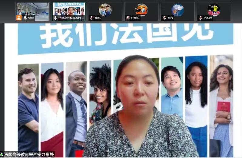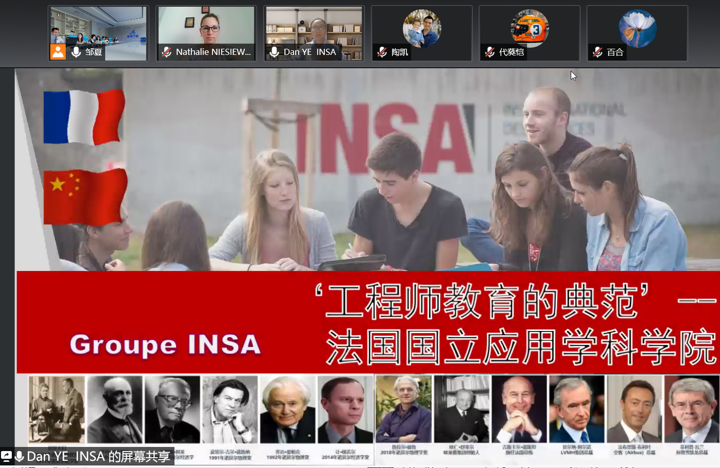 活动下半场,陶凯首先向参会人员介绍了INSA集团。INSA作为一个法国工程师大系统,被誉为“工程师的典范”,在法国拥有7所学校,两校的成功合作为西工大和INSA集团的全面合作积累了丰富的经验。之后,里昂国立应用科学学院博雅教授、法国国家科学研究中心终身研究员朱跃敏教授简单介绍了本次参会的法方人员Natalie、叶丹和Ben。接着法国里昂国立应用科学学院、法国国立应用科学学院集团驻中国代表处首席代表叶丹从科研实力、学科特色、就业方向、未来发展等方面展示了INSA的特点与优势。随后,朱跃敏、Natalie、Ben向机电学院师生们问好,介绍了INSA集团与西工大的合作历史,为双方能取得今天这样的合作成果深感欣慰,并对于机电学院学生赴法深造表达衷心的期盼。我校师生通过线上及线下两种方式踊跃参与,并积极与法方高校和机构代表进行了深入互动。