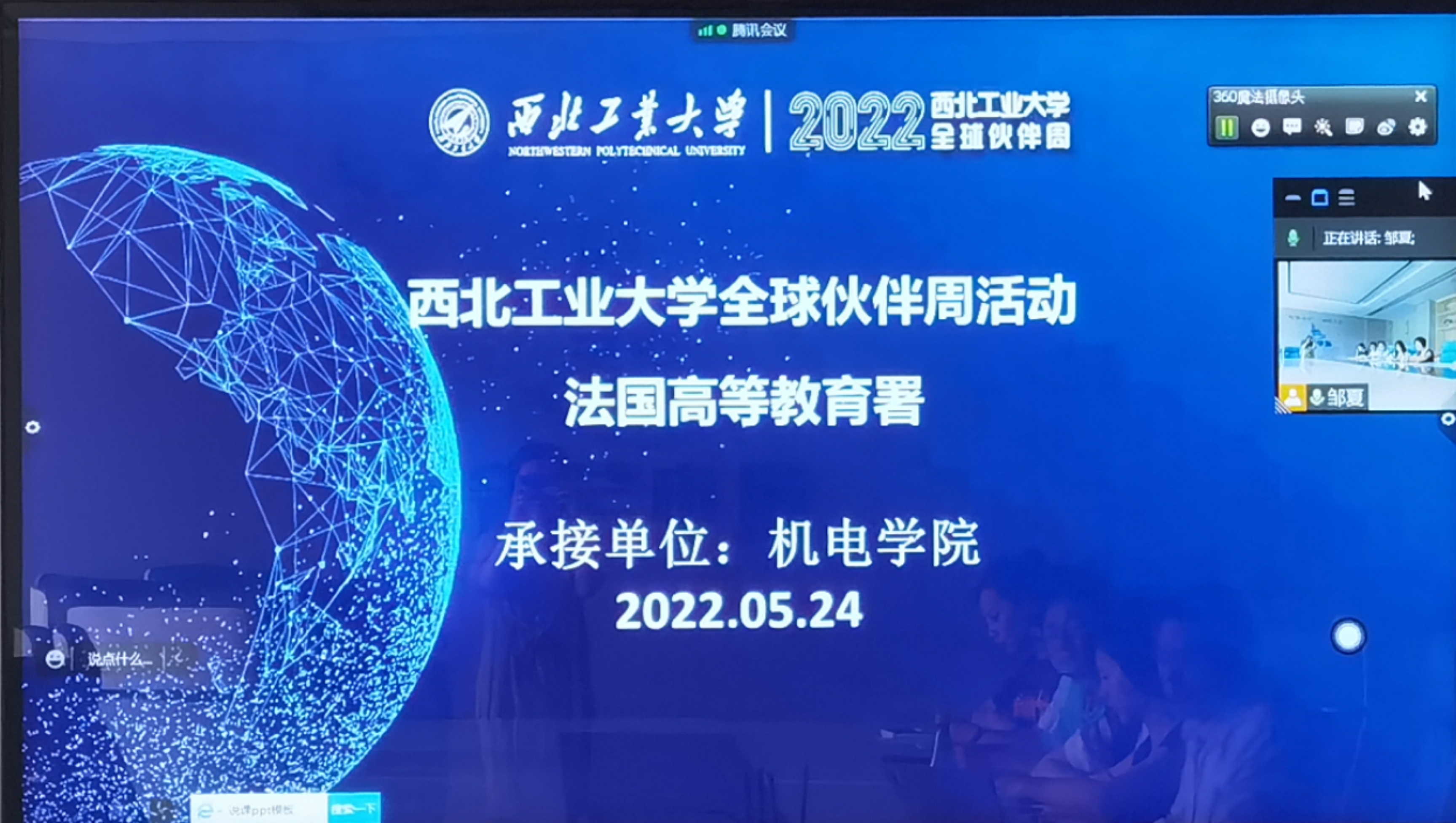 2022年5月24日14:30-16:30,机电学院顺利举行了全球伙伴周活动,活动采取线上与线下相结合的方式,线上以腾讯会议为平台,线下在友 谊校区航空楼B416举行。本次活动由机电学院联合法国高等教育署、法国国立应用科学学院以及国际合作处共同举办。机电学院院长助理陶凯主持会议,国际合作处杨洁、机电学院外事秘书邹夏、法国高等教育署西安办事处负责人穆锐、法国国立应用科学学院中方负责人叶丹及在校生参加了此次活动。活动内容主要包括法国留学学习与生活交流以及与INSA合作项目介绍。