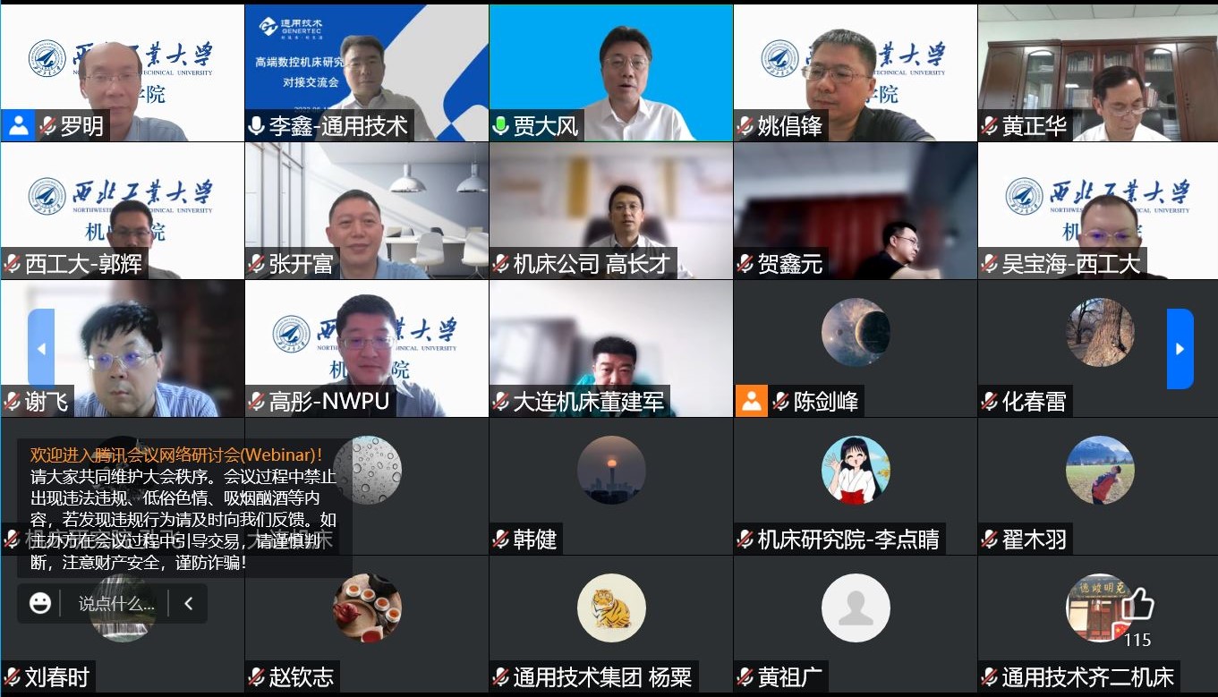 6月13日,中国通用技术集团-西北工业大学高端数控机床产学研对接交流会通过线上方式召开。中国通用技术(集团)控股有限责任公司副总经理、党组成员贾大风,科技创新部副总经理李鑫,通用技术机床公司总经理、机床研究院院长贺鑫元,机床研究院党委书记黄正华;西北工业大学校长助理张开富、机电学院副院长罗明、航空发动机高性能制造工信部重点实验室主任姚倡锋、航空发动机先进制造技术教育部工程研究中心主任吴宝海和相关研究领域教师,以及通用技术机床公司、机床研究院、沈阳机床、大连机床、齐二机床等机床企业和西安交通大学、北京航空航天大学等科研院所专家近200人参加了会议。