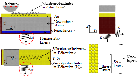 硅基(Si)材料广泛应用于微纳器件制造,但硅的摩擦性能较差。为进一步提高颤振环境下微纳器件的可靠性,该课题组研究了不同润滑工况下硅基纳米器件碰撞滑动接触摩擦性能。空间苛刻的服役环境以及微纳器件的尺寸效应对润滑方式和润滑材料提出了更为严格的要求,软金属和二硫化钼因其优异的空间润滑性能被广泛应用于空间机构。该课题组综合考虑接触体单方向/多方向振动碰撞以及基体单方向/多方向振动等因素,建立了不同润滑工况下碰撞滑动接触分子动力学模型,研究了金膜润滑(图4)、二硫化钼润滑以及软金属与二硫化钼协同润滑的碰撞滑动接触摩擦性能。研究表明,三层金膜稳定性较差,碰撞滑动接触过程中压头前端原子堆积现象显著,增大了压头滑动过程中所受阻力;九层金膜稳定性较好,具备较好的摩擦性能。此外,不同金膜层数润滑工况下平均摩擦力展示出不同的频率依赖性。