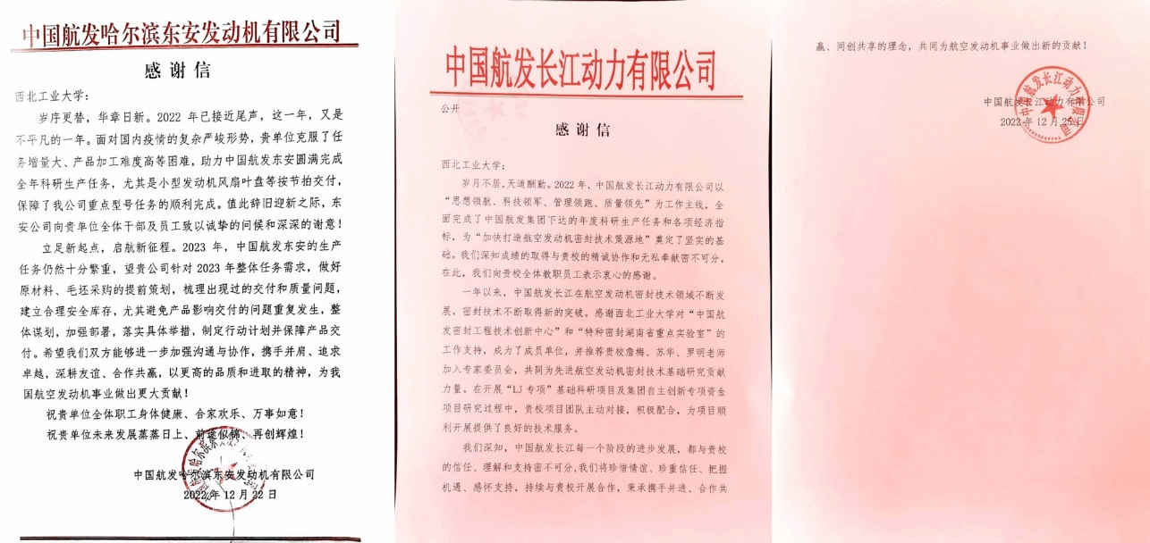 近日,中国航发哈尔滨东安发动机有限公司和中国航发长江动力有限公司分别给学校发来感谢信。在国内疫情的复杂严峻形势下,机电学院航空发动机高性能制造工信部重点实验室、密封与润滑等相关团队克服了诸多困难,按时完成了中国航发东安小型发动机风扇叶盘零部件研制任务、积极配合中国航发长江开展了国家重大专项及集团自主创新专项资金项目的实施,助力中国航发东安和中国航发长江圆满完成了全年科研生产任务。