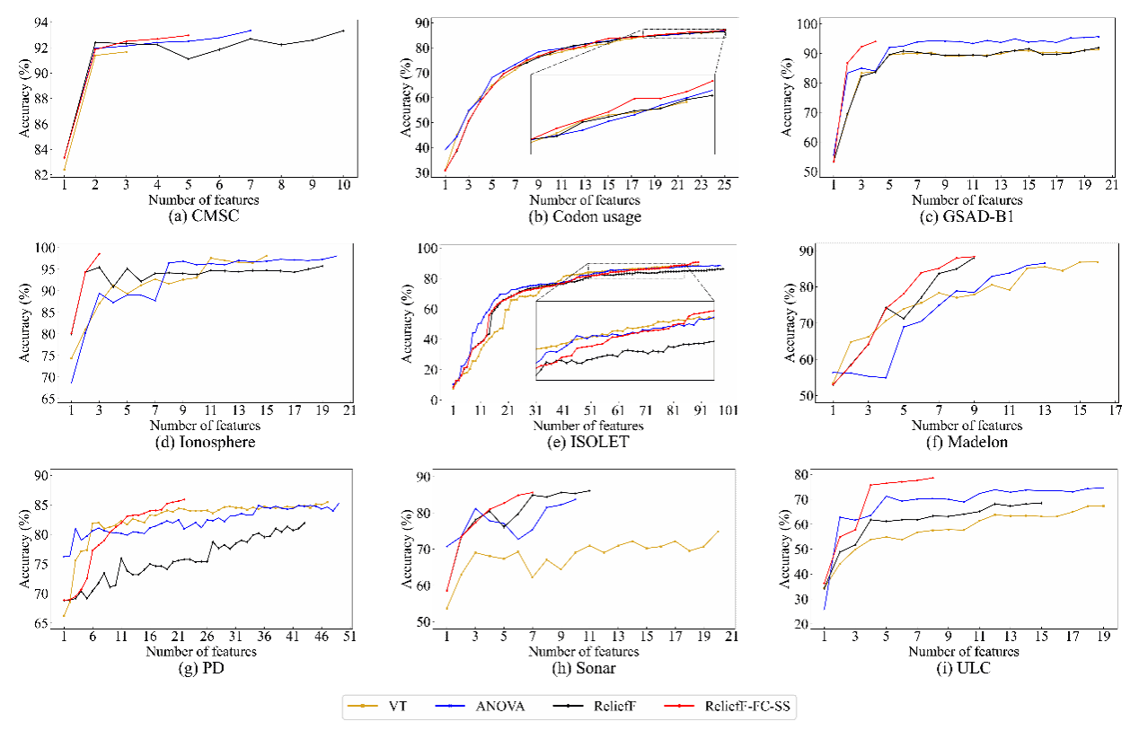 航空发动机是典型的资本密集型和技术密集型高科技产品,如果航空发动机试车时出现性能不达标、振动超限等实际工程问题,由于装配与质量检验试车之间缺乏清晰的映射关系,以目前的技术难以快速定位相关关键装配指标。挖掘航空发动机装配数据和试车数据之间的关联关系,对指导制造与装配环节,提高发动机出厂合格率具有重要意义。由于航空发动机结构复杂,装配指标繁多,如何通过特征选择的方式从高维装配指标空间中捕捉关键信息是航空发动机研究领域的一项难题,受到众多学者的高度重视。课题组通过将特征关联性分析方法引入传统的ReliefF特征选择算法,并结合逐步筛选的方式提出了ReliefF-FC-SS算法,定量研究了特征和特征之间、特征和类别之间的关联性,旨在尽可能从高维特征空间中提取高质量的低维特征子集。为了验证该算法的有效性,研究团队结合9个公开数据集展开分析。实验结果证明提出的ReliefF-FC-SS算法相较于其它的传统特征选择算法,能够从原始特征空间中捕捉到包含关键信息的最优特征子集,显著降低了特征子集的维度和噪声对模型产生的负面影响。