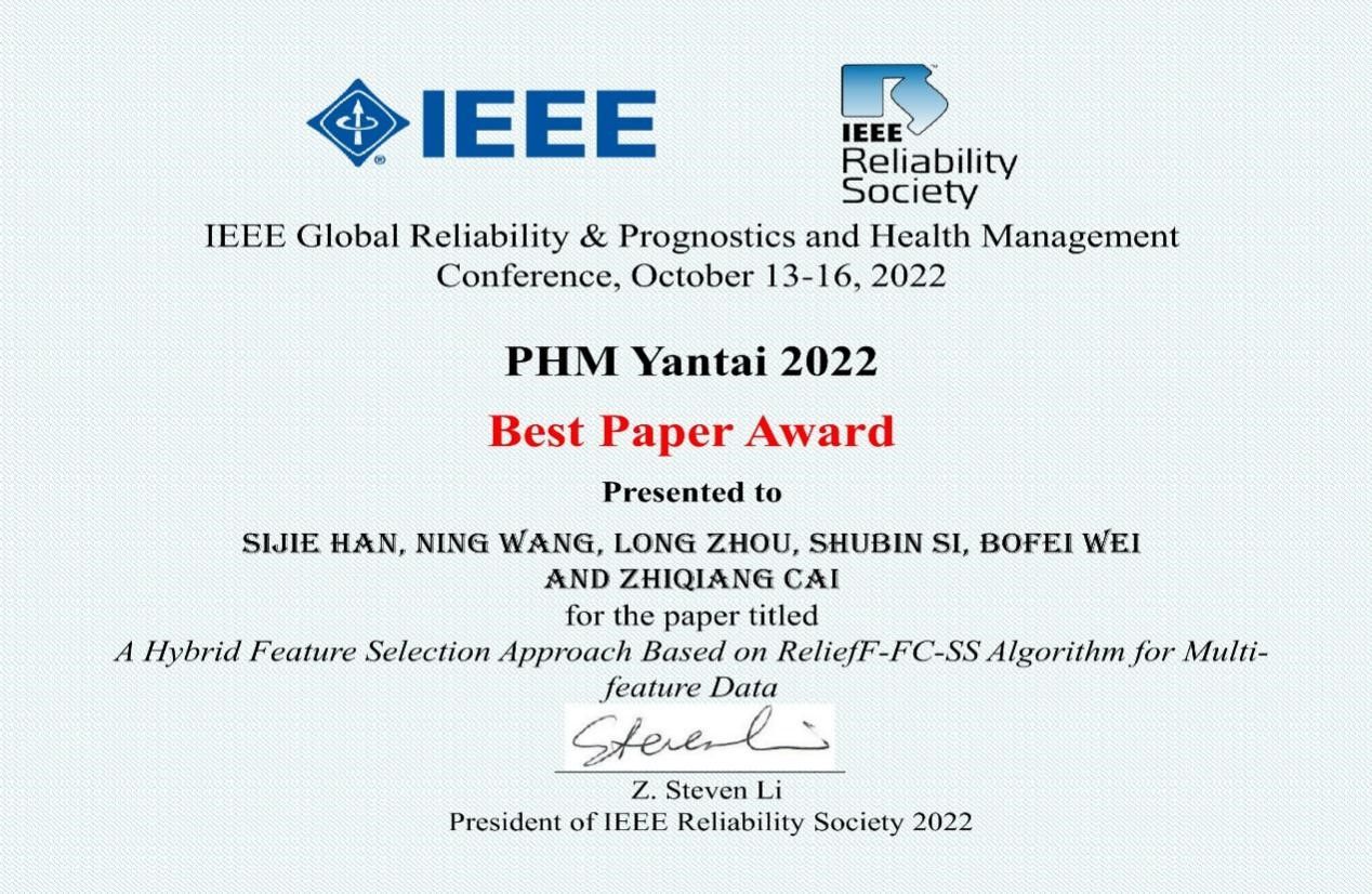 针对以上问题,机电学院蔡志强教授课题组通过特征选择的方式从海量原始数据中获取重大装备故障诊断有效信息,相关成果《A Hybrid Feature Selection Approach Based on ReliefF-FC-SS Algorithm for Multi-feature Data》被13th IEEE Global Reliability & Prognostics and Health Management Conference(PHM)国际顶级会议录用并荣获“Best Paper Award”。该会议由IEEE可靠性协会提供赞助和支持,致力于提高机械装备和产品的可靠性、可用性、系统安全性和维护性。会议涉及航空航天和军事系统、电子设备、制造工艺、云计算和核动力等各个研究领域,汇集学术、工程和管理学科的世界级专家,为学术思想交流提供了一个重要的跨学科交流平台。论文第一作者是西北工业大学机电学院韩思杰硕士研究生,通讯作者为西北工业大学机电学院蔡志强教授。该论文的研究成果由西北工业大学机电学院作为第一单位和通讯作者单位、西安航空发动机(集团)有限责任公司作为合作单位共同完成。该项研究工作受到国家自然科学基金重点项目、国家自然科学基金面上项目和陕西省重点研发项目支持。