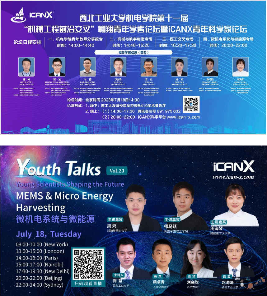 为贯彻学校人才工作会议精神,落实《人才工作高质量发展行动计划》,加速学院引才聚才进程,7月18日,机电学院第十一届“机械工程前沿交叉”翱翔青年学者论坛暨iCANX青年科学家论坛采取线上、线下相结合形式隆重举办。本届论坛以多元学术专场为特色,激发学术创新,包括学院青年教师分享报告、机械与航宇制造专场、医工交叉专场、微机电系统与微能源专场。来自南洋理工大学、新加坡国立大学、英国贝尔法斯特女王大学、英国诺丁汉大学、英国帝国理工学院、法国里昂大学国立应用科学学院等海内外知名高校15位青年学者参加本届论坛汇报及交流。机电学院院长常洪龙、副院长罗明、学术委员会委员、系主任、教授代表、青年教师及学生代表参加论坛,线上线下参与人数累计高达1.86万人。论坛由罗明主持。