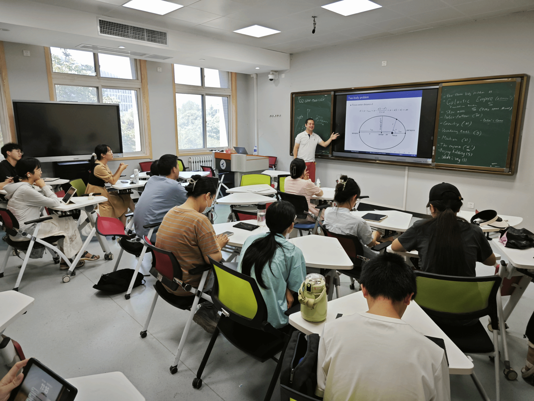 《科幻中的科学》课程共计16个学时,以科幻小说为切入点,讲解了关于宇宙空间中星体、飞行器的运行规律与背后的力学原理;讲解了三体问题、黑洞等科幻作品中频繁提及的概念背后的科学理论;以地球-火星模型为例讲解了行星间转移的运动学与力学问题。此外,Paolo Massioni副教授引导同学们就太阳系旅行的可能性与核动力宇宙飞船在太阳系主要天体间直线最速降轨迹的飞行时间和推进剂消耗量展开探索。