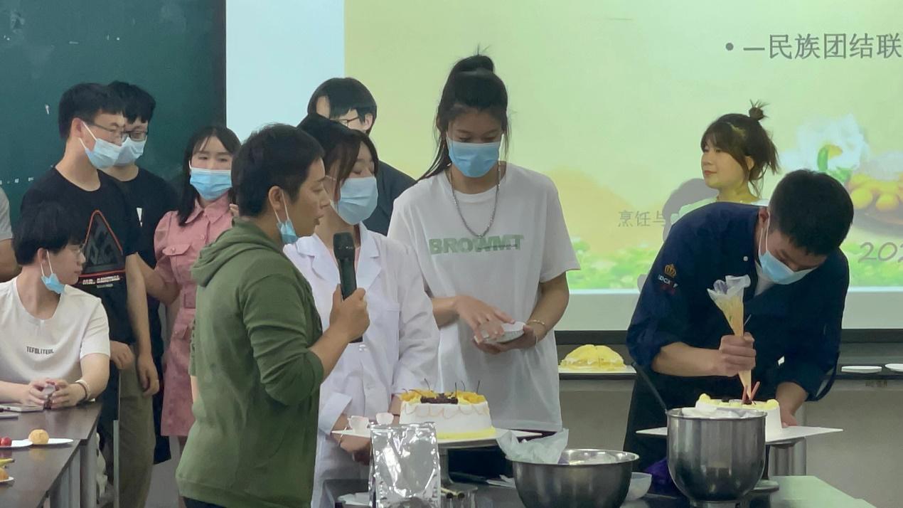 (学生展示蛋糕裱花,现场学生共同参与)