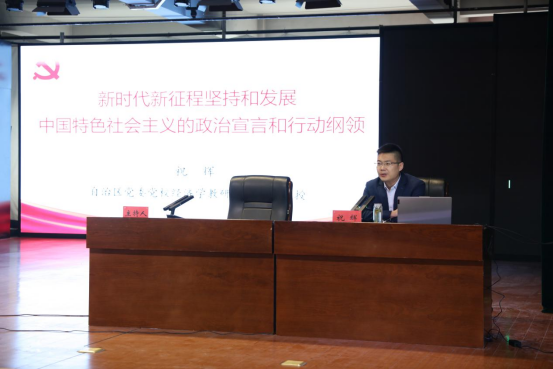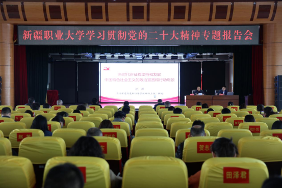 为进一步深入学习贯彻党的二十大精神,切实把广大党员干部师生的思想和行动统一到会议精神上来,3月16日下午,自治区党委党校经济学教研部祝辉教授为我校师生开展党的二十大精神专题学习报告会,报告主题为《新时代新征程坚持和发展中国特色社会主义的政治宣言和行动纲领》。报告会设北京路校区主会场、喀什路校区和友好路校区三个会场,参加报告会的有学校领导、师生代表共计600余人。