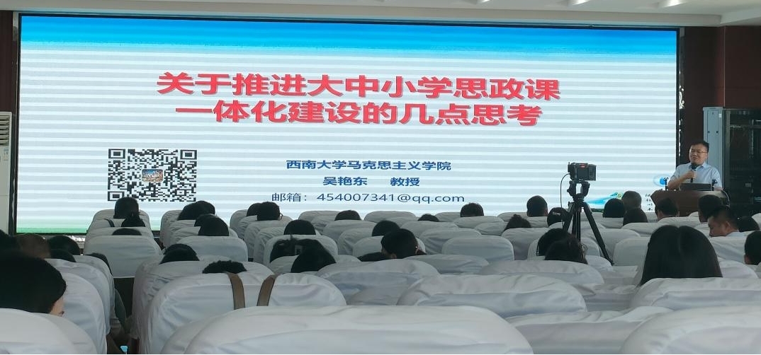西南大学马克思主义学院副院长、博士生导师、博士后合作导师、中央第十一批援疆干部、新疆和田师范专科学校党委委员、副校长吴艳东教授进行了题为《关于推进大中小学思政课一体化建设的几点思考》的讲座,从大中小学思政课一体化的内涵解读、政策依据,大中小学思政课一体化不是一个“新”问题、由来已久,大中小学思政课一体化是一个“倒逼机制”、要尊重规律、研究学情,大中小学思政课一体化不仅是一个抽象的原则和理念、更是一个现实性很强的实践行为,大中小学思政课一体化需要教师既要有“跨界”意识、又要有“边界”意识等5个方面进行了解读,坚持问题导向,提出要形成教研共同体,积极走进相邻学段课堂,做到以研究为抓手、以成果为导向。