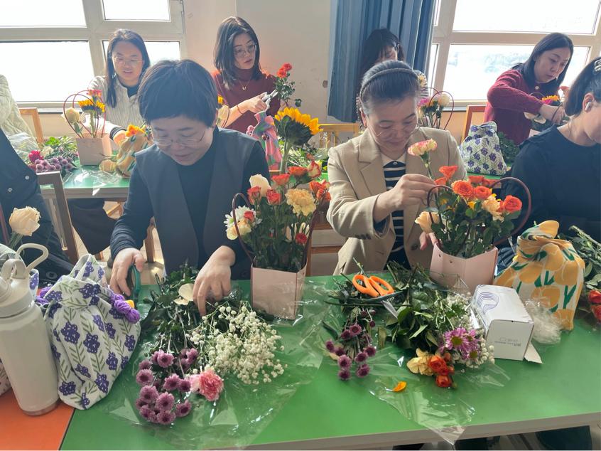 在主题插花环节,专业插花师从花材选择、色彩搭配、造型设计等方面进行讲解指导。女教职工们暂别忙碌,共赴这场与花相约的美好时光。大家巧妙构思、精心修剪,将玫瑰、康乃馨、向日葵等花材错落有致地搭配,创作出一篮篮独具匠心的插花作品。活动现场花香四溢,欢声笑语不断,大家相互交流技巧、拍照分享,感受生命的绽放,在芬芳馥郁的氛围里滋养心灵的从容,在艺术创作中舒缓身心、陶冶情操。