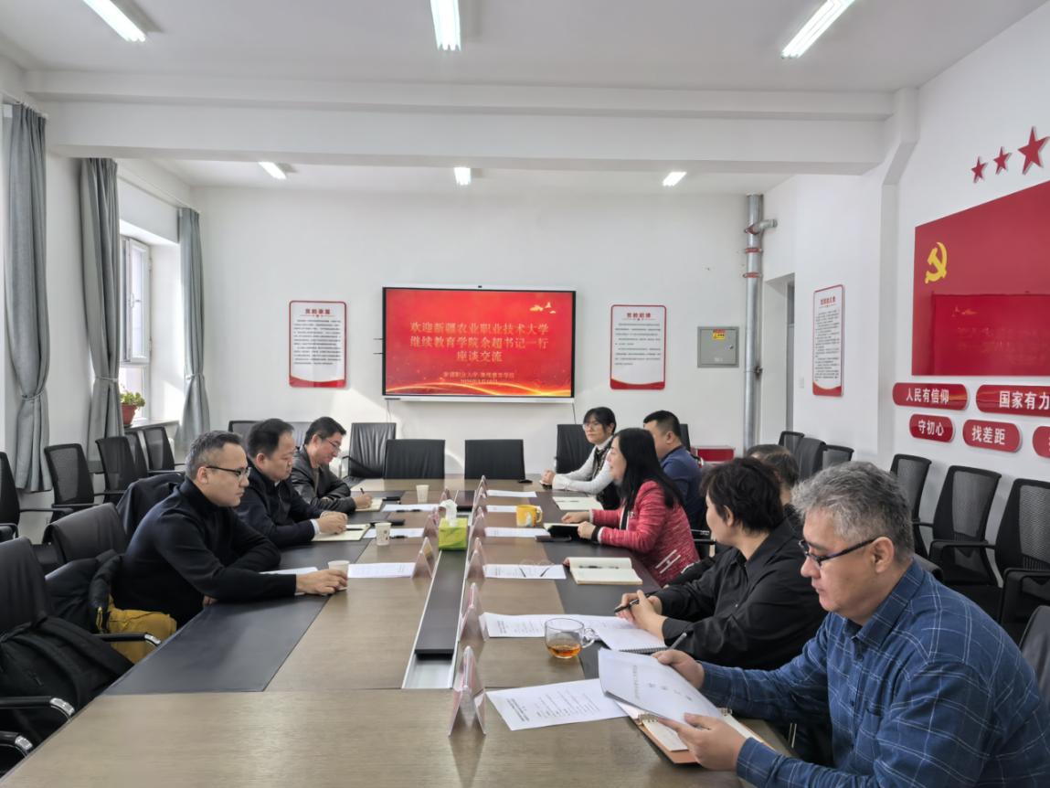 座谈会上,继续教育学院直属党支部书记连卫钰同志详细介绍了我校及继续教育学院的基本情况。新疆农业职业技术大学继续教育学院书记、院长余超同志就服务“三农”领域开展继续教育和社会培训的特色做法进行介绍。双方围绕师资队伍建设、招生宣传、培训项目开发等共同关心的问题展开深入讨论。座谈会结束后,余超书记一行对我校普通话水平测试工作站进行了参观。