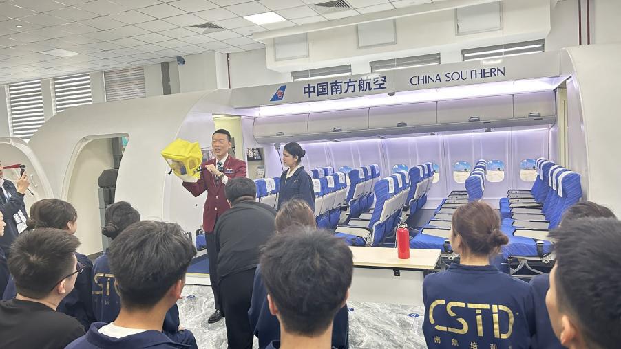 本次活动中同学们沉浸式体验了乘务员培训中的核心课程,包括波音737客舱特情处置、波音787客舱模拟器、体验跳滑梯、参观灭火训练厅和水上训练厅并体验客舱灭火、学习职业形象礼仪和应急医疗救护、南航空中茶苑茶艺展示等十多个项目。
