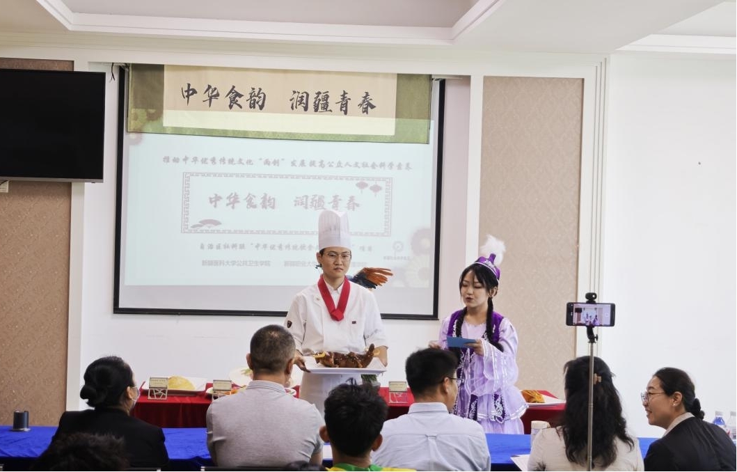 活动第二环节,烹饪与餐饮管理学院学子分别展示了“锦绣江山映花笺”“路畔金酥映琵琶”“松鼠鱼”“映日珍馐沁昆仑(八珍俯首牛)”四道主题菜品。精湛技艺点燃全场,将艺术审美与烹饪技法完美结合。新疆医科大学学子则化身文化使者,为每道菜品注入历史典故与地域文化内涵,以诗化语言诠释饮食哲学,赢得阵阵掌声。