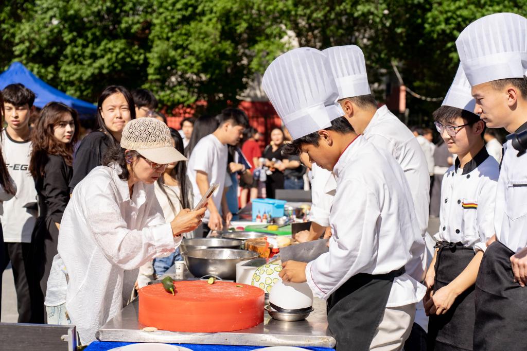 烹饪工艺与营养(西餐烹饪)、烹饪工艺与营养(中餐烹饪)、食品智能加工技术专业的学生结合毕业设计思路进行特色产品制作与展示,涵盖蒙眼刀工展演(切土豆丝、蜈蚣花刀、菊花豆腐)、食品雕刻主题展台、主题花色冷拼、热菜作品、非遗面塑、面点作品、拉面展示、果酱画、裱花蛋糕展示、面包展示及西点展示。检验学习成效的同时,增强学生对专业的认知。