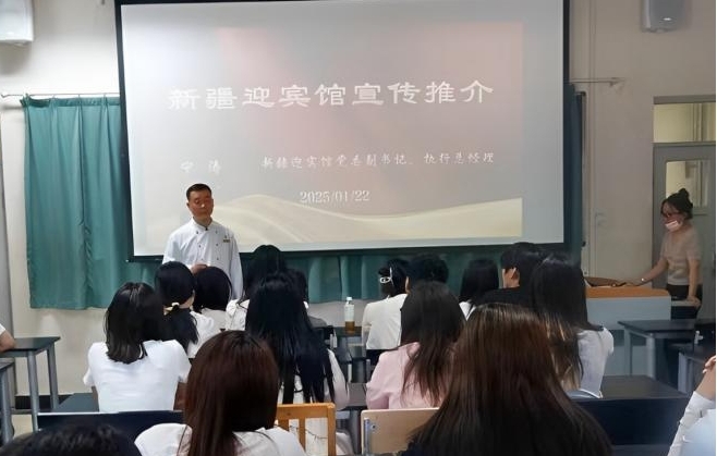 邀请新疆迎宾馆、百胜(中国)投资有限公司、乌鲁木齐大河宴餐饮管理有限公司、布朗先生、安古雷基石西餐厅,共5家企业入校开展企业文化宣讲会,主要针对学生实习和就业相关工作,了解企业的文化及岗位需求,加深校企双方的合作。