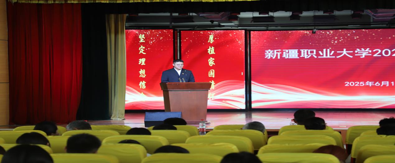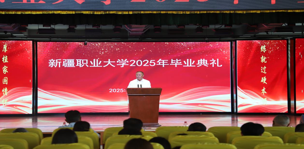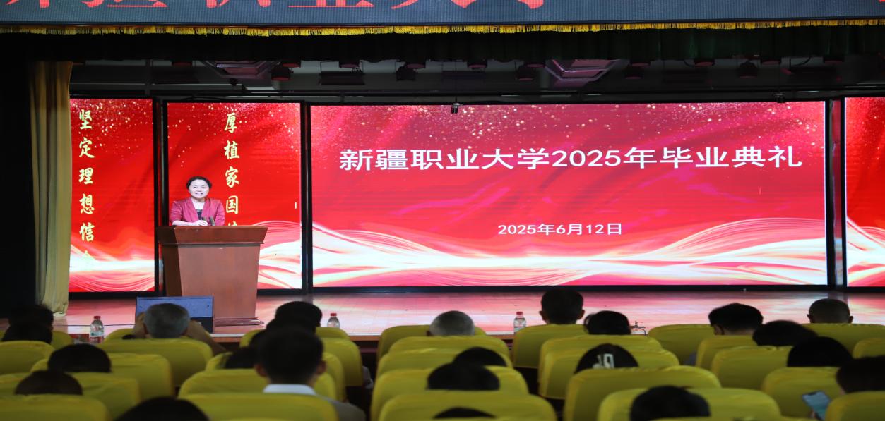 6月12日上午,我校三号教学楼四楼礼堂内,庄重与温情交织,感动与豪情共振。一场以“逐梦新征程,启航向未来”为主题的2025届毕业生毕业典礼在此隆重举行。校党委书记黄朝华,校党委副书记、校长阿不力克木·阿不德卡德尔等全体党委常委出席典礼,近千名毕业生代表与校领导、教师、辅导员、班主任等教育工作者齐聚一堂,共同见证这场满载育人成果的青春盛典。典礼由校党委副书记罗华主持,校党委书记黄朝华为毕业生讲授“最后一课”。此次典礼不仅是一次毕业仪式,更是一堂生动深刻、浸润心田的“大思政课”和职业精神传承礼。