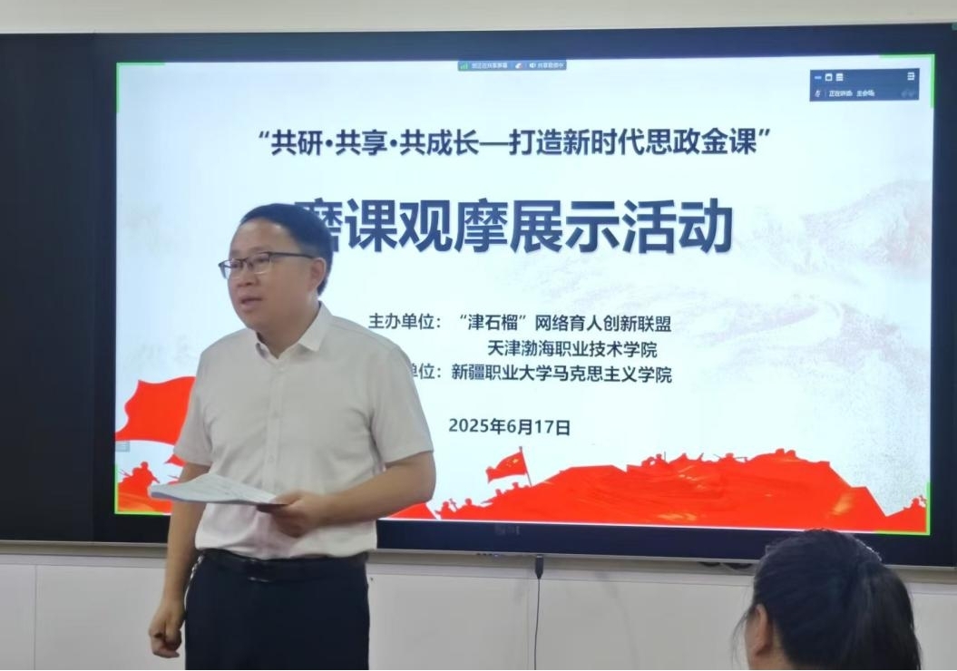 为深入学习贯彻习近平总书记关于学校思想政治理论课建设的重要指示精神,全面落实新时代学校思想政治理论课改革创新要求,进一步提升联盟校思政课教师政治素养与业务能力,6月17日,由“津石榴”网络育人创新联盟和天津渤海职业技术学院主办,我校马克思主义学院承办的“共研·共享·共成长—打造新时代思政金课”磨课观摩展示活动在我校马克思主义学院举办。本次活动由天津渤海职业技术学院网信办主任张蕊主持,我校马克思主义学院党总支书记、副院长杨柯进行点评,来自天津渤海职业技术学院、乌鲁木齐职业大学、新疆轻工职业技术学院和我校等8位思政课教师参加了现场展示活动。活动采取线上线下相结合的方式,主会场设在我校,分会场设在天津渤海职业技术学院、东堤头中学,以及吐鲁番市教育局和乌鲁木齐市新市区教育局。共有来自大中小学400多名思政课教师观摩展示活动。