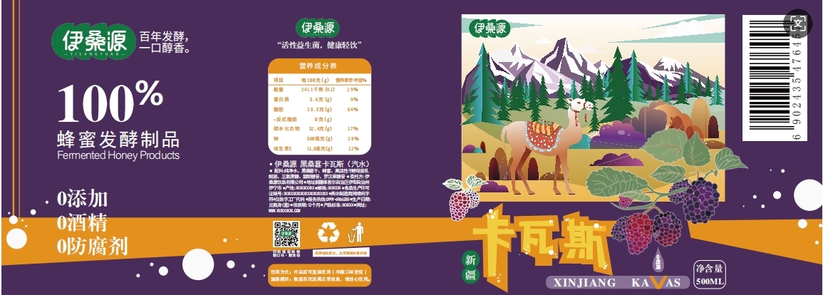 设计团队由3名专业教师与3名学生组成,以“传统工艺+现代视觉”为核心方向,他们深挖卡瓦斯的文化内涵与新疆地域特色,将天山草原、巍峨雪山、伊犁蓝等标志性元素融入设计,通过现代语言重新诠释——既保留“百年发酵,一口醇香”的传统韵味,又以“活性益生菌,健康轻饮”定位赋予年轻时尚感,“0添加”“0酒精”等标注更契合健康消费趋势,实现传统与现代的完美融合。