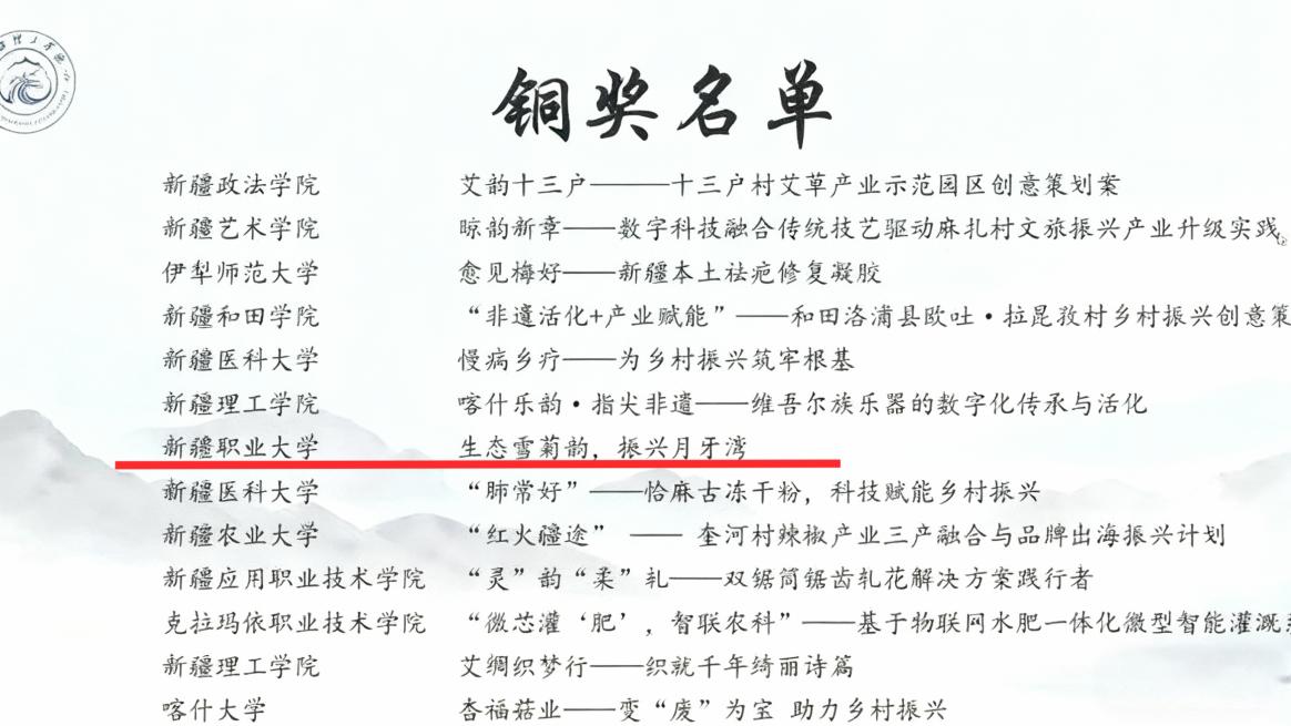 新疆维吾尔自治区第四届大学生乡村振兴创意大赛省级决赛、成果通报暨闭幕式在新疆理工学院圆满落幕。我校电力学院由郭鹏程、玛尔哈巴·艾斯克尔、张蕴玥老师指导,供用电技术专业学生武祺祺、陈学仪、赵竑舟、张伟组成的参赛团队,凭借《生态雪菊韵,振兴月牙湾》项目脱颖而出,斩获自治区铜奖,以青春创意回应乡村需求,彰显了学院师生扎根新疆大地、服务乡村振兴的育人成效。