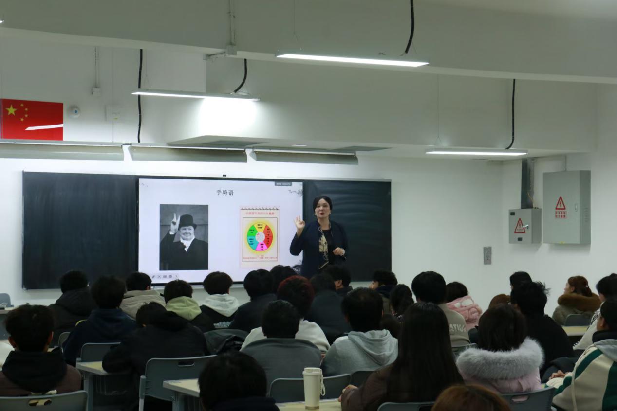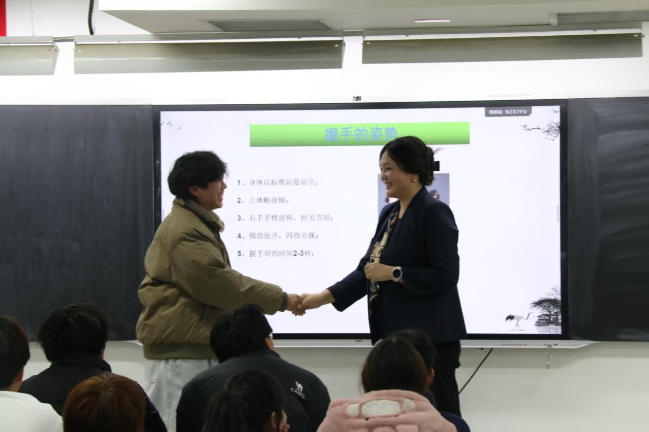 现代礼仪部分是本次讲座的重彩篇章。谢老师结合大学生生活场景,以问候礼仪为切入点,系统梳理了亲吻礼、贴面礼、合十礼等国际通行礼仪的文化渊源,尤其聚焦于握手礼的前世今生与实践要义。她从握手的时机选择、姿态规范、先后顺序、力度掌控、时长把握,到眼神交流、表情管理及禁忌事项,层层递进、细致入微地展开讲解。谢老师特别强调,握手时应身体微倾以示尊重,拇指自然张开传递真诚,时长以2-3秒为宜,并严格遵循“主人先伸、长者先伸、尊者先伸、女士先伸”的礼仪次序。此外,讲座还延伸至鼓掌礼仪的动作要领与适用场景,以及社交距离的四个层级划分——亲密距离、个人距离、社交距离与公共距离,帮助同学们在日常交往中精准把握分寸,于细微处彰显修养。