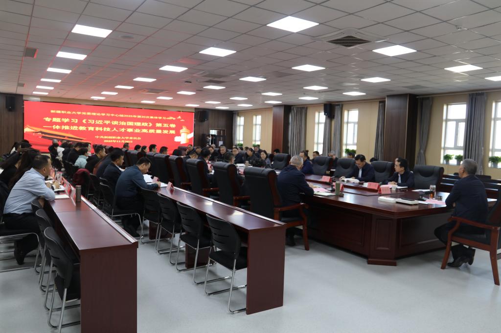 会议要求,一是深刻领会核心要义,筑牢思想根基。《习近平谈治国理政》第五卷集中展现了党的创新理论的最新成果,是新时代坚持和发展中国特色社会主义的行动指南。今天重点学习《激发各类人才创新活力和潜力》《朝着建成教育强国目标扎实迈进》等文章,进一步要求学校领导干部,深刻领悟“两个确立”的决定性意义,增强“四个意识”、坚定“四个自信”、做到“两个维护”,确保高校始终成为坚持党的领导的坚强阵地,更加系统掌握贯穿其中的马克思主义立场观点方法,将学习成果转化为破解高等教育改革发展难题的“金钥匙”。二是聚焦主责主业,推动学习成果转化。高校作为教育、科技、人才一体推进的战略支点,必须将学习成效转化为服务国家战略的实践能力。要高质量编制“十五五”规划,落实好教育强国和教育强区规划纲要,深研国家职教本科建设标准,突出技能型高校定位,统筹2027年升格职业本科与2030年远景目标,科学构建“1+9”规划体系。要精准对接自治区重点产业集群需求,精准定位学校服务面向、办学定位和规模目标,梳理规划期重点建设项目,确保与自治区“十五五”规划同频共振。针对升格指标短板建立“全校一盘棋”攻坚机制,纳入学校“十五五规划”和部门年度重点任务。深化与教育部规划建设中心、全国机械行指委战略合作,构建“组团式援助”申报模式,通过共建产业学院、共享师资、联合科研提升办学层次。加速推进与达坂城区政府合作,打造市域产教融合标杆。要进一步优化人事绩效管理制度,建立科学合理、张弛有度、催人奋进的激励机制。要进一步完善内部治理结构,优化资源配置方式,健全科研评价体系,落实各项人才政策,为高质量发展注入持续动能。三是坚持以上率下,构建长效机制。党委班子成员和处级干部要发挥“关键少数”作用,通过“第一议题”制度、党委理论中心组等形式,带动全校师生形成《习近平谈治国理政》第五卷学习热潮。充分利用周三政治理论学习日、周五党员活动日等制度,面向全体教职工开展专题学习教育,确保全覆盖、无死角。