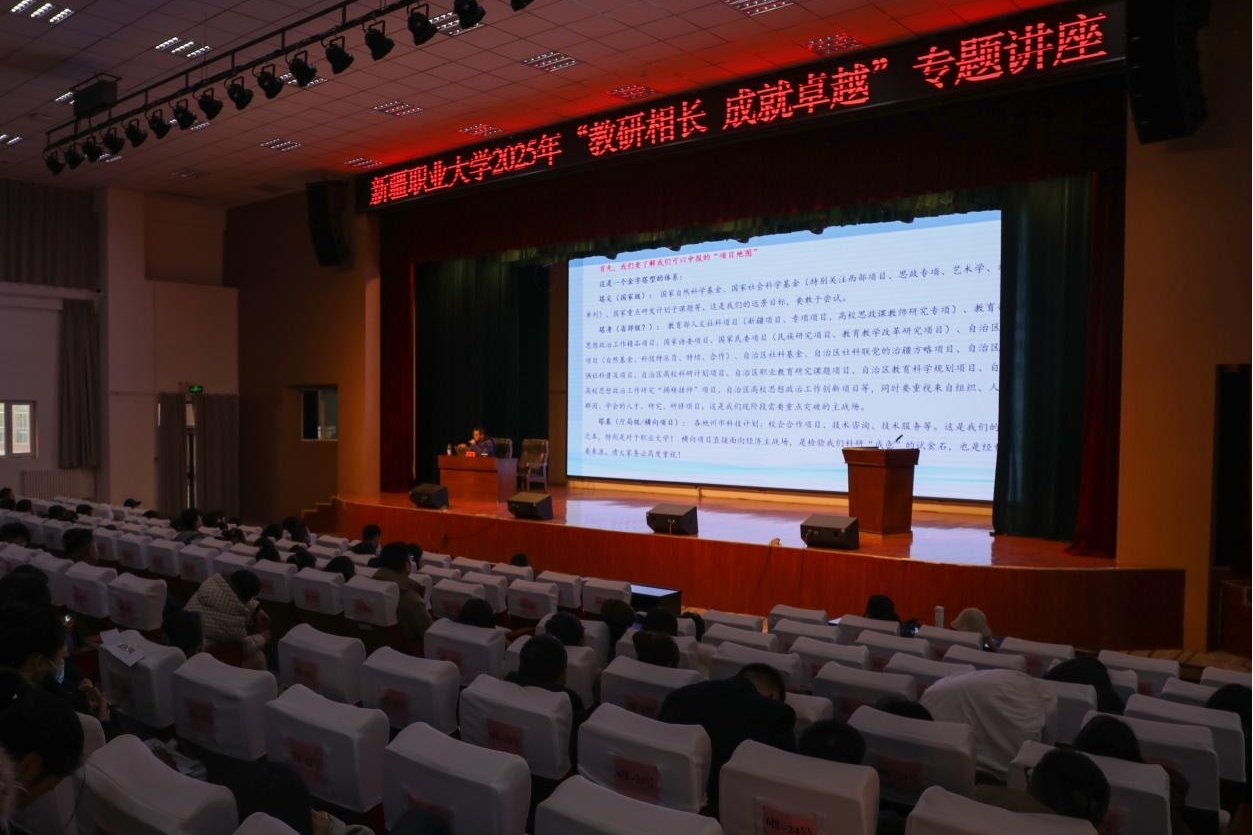 为进一步提升学校教师科研项目申报能力、夯实科研工作基础,助力职业本科建设与产教融合发展,我校于11月26日特邀请了巴楚县第二中学正高级教师、研究员、研究馆员的罗凯教授开展科研能力提升专题讲座。副校长李亮出席讲座并致辞,全校广大教师参与学习交流。