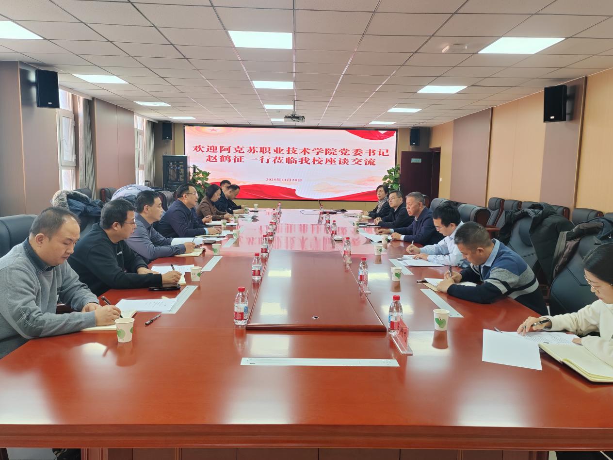 11月28日,阿克苏地委教育工委常务副书记、阿克苏地区教育局党组书记、阿克苏职业技术学院党委书记赵鹤征一行来我校调研交流,校党委书记黄朝华,党委常委、副校长李亮,党委常委、组织部部长(人事处处长)徐晓伟及相关职能部门负责人热情接待,陪同实地参观并与调研组一行进行了深度座谈。