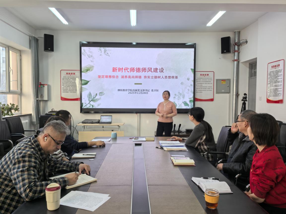 为深入贯彻新时代党的治疆方略,落实师德师风建设“四位一体”工作要求,11月28日,我校继续教育学院直属党支部组织全体党员及教职工开展了“加强师德师风建设 共谱发展育人新篇”党旗映天山主题党日活动,以政治学习铸魂、师德研讨固本、实践感悟聚力,积极推动党建与师德师风建设深度融合。