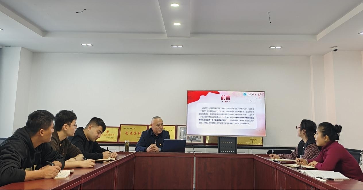 为深入学习贯彻党的二十届四中全会精神,深刻领会“十五五”规划的战略部署,引导党员干部进一步统一思想、凝聚共识,更好服务学校发展和地方建设。近期,校党委常委、副校长肖克拉提·米尔扎同志围绕“深悟党的二十届四中全会精神实质,凝聚奋进‘十五五’新征程磅礴力量”主题,为所属的招生就业处审计处党支部全体党员讲授了一堂内容丰富、内涵深刻的专题党课。