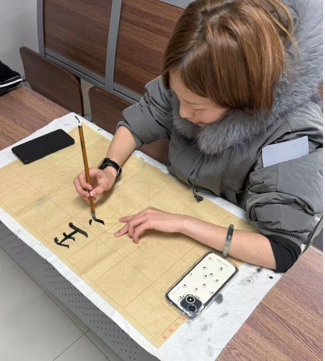 在笔法技巧讲解环节,通过现场示范,详细演示了楷书、行书的基本笔画写法、间架结构规律及运笔发力技巧,针对学生日常书写中常见的“横画倾斜”“结构松散”等问题进行逐一拆解,手把手指导学生调整握笔姿势、掌控运笔节奏。