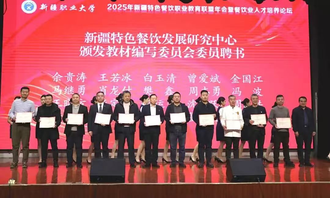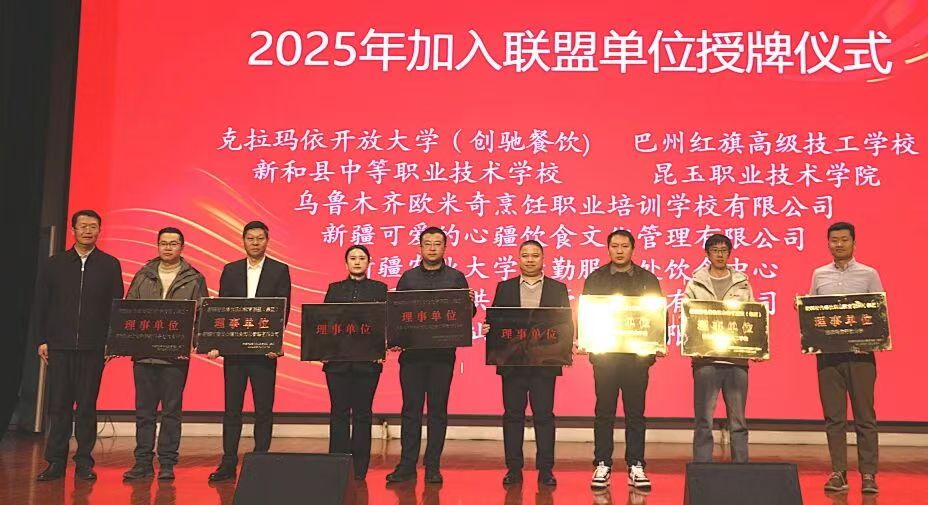 年会全面梳理了近三年来联盟在特色餐饮职业教育领域的建设成果,校党委常委、组织部部长、人事处处长徐晓伟宣读了新疆特色餐饮发展研究中心组织架构,学校领导为新疆特色餐饮发展研究中心成员颁发证书与聘书。同时为现代餐饮产教融合实训基地、新疆抓饭非遗博物馆——研习基地揭牌。学校与克拉玛依开放大学签订框架合作协议,并与新疆塔林鼎尚餐饮管理(集团)有限公司等企业达成校企联合开发教材、订单班培养等合作意向,同时为2025年新加入联盟的成员单位授牌以及为新疆特色餐饮发展研究中心教材委员会委员颁发聘书。