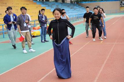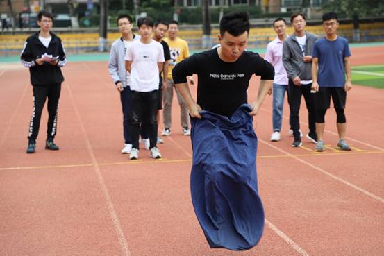 运动会的第二个项目是袋鼠接力,比赛规则是每个赛道两端各站五个人, 共十人依次穿着袋鼠服进行接力比赛。有不少同学在比赛过程中由于没有掌握好节奏而受了伤,场务志愿者及时的提供了医药及保护,并提醒大家注意安全。