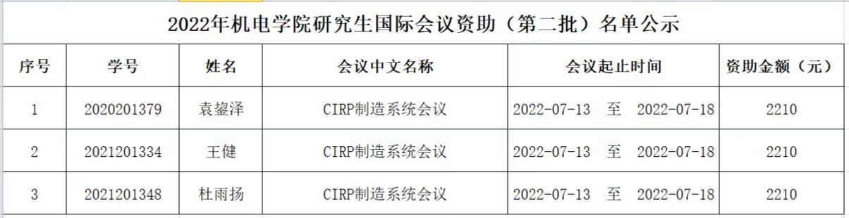 2022年机电学院研究生国际会议资助(第二批)名单公示