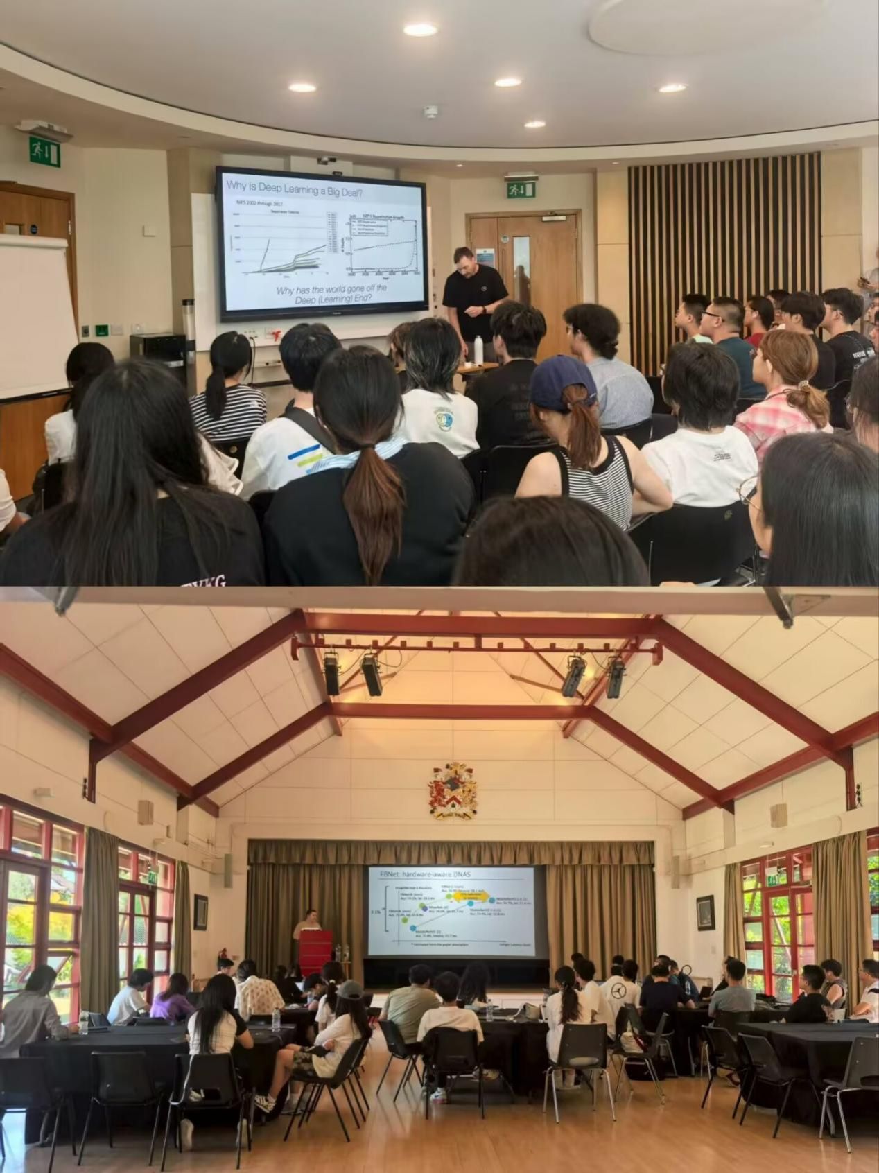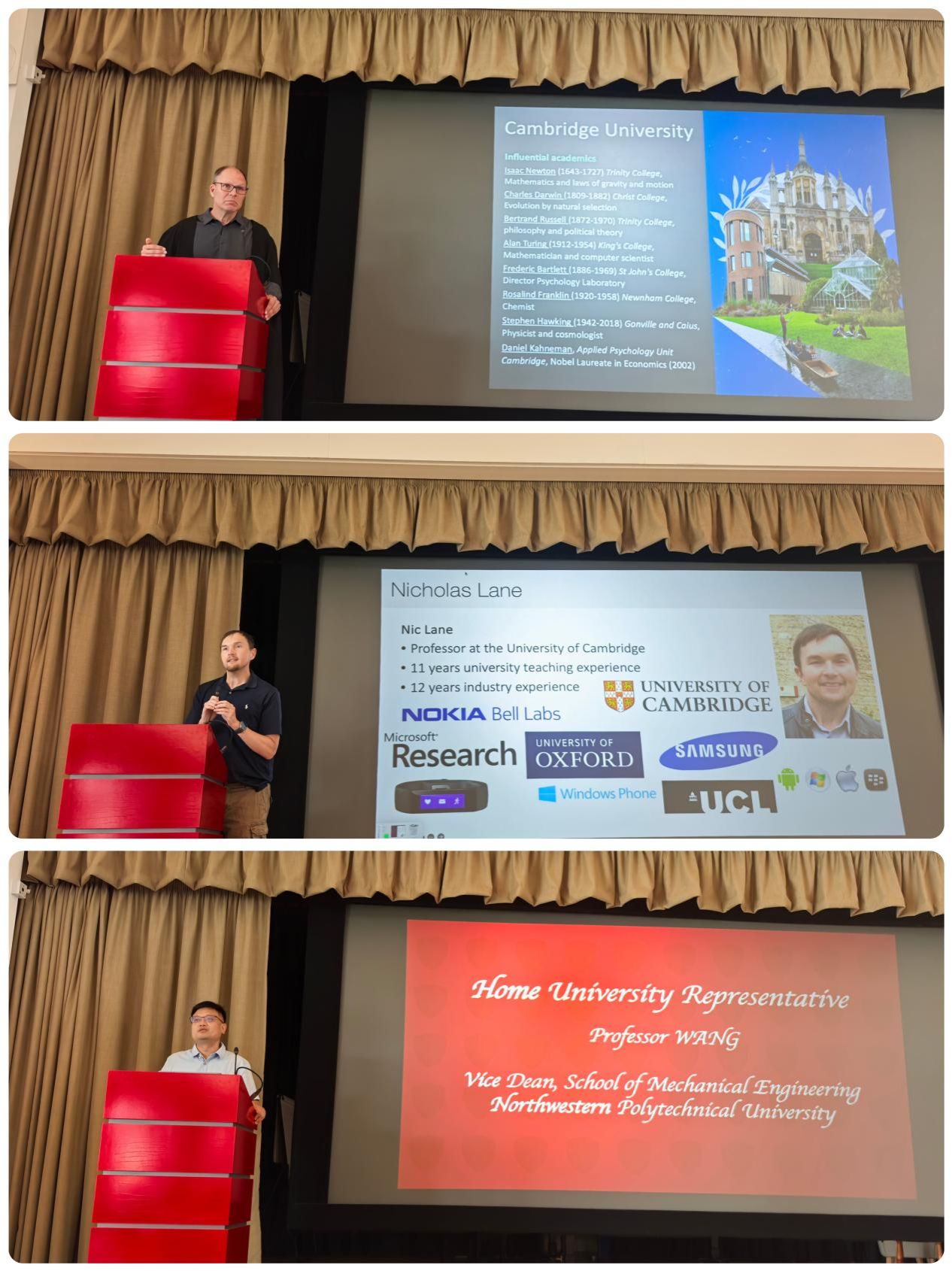 结束牛津的行程后,代表团奔赴另一学术圣地——剑桥大学。开业典礼上,剑桥大学Martin Vestergaard和Nicholas Lane教授分别介绍了剑桥大学的悠久历史及深度学习的相关知识。西北工业大学机电学院汪焰恩副院长代表致辞。