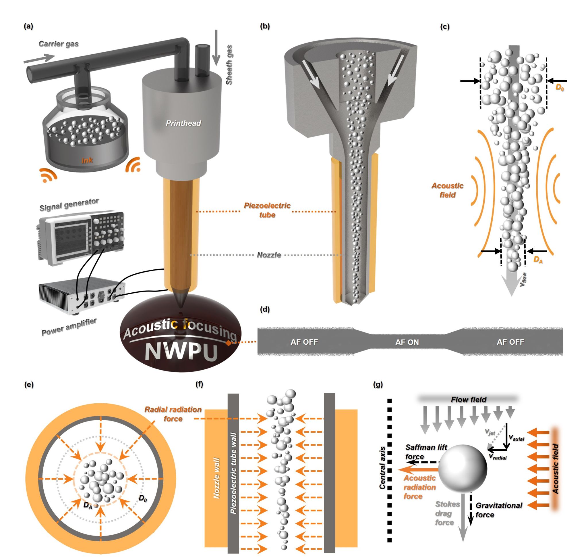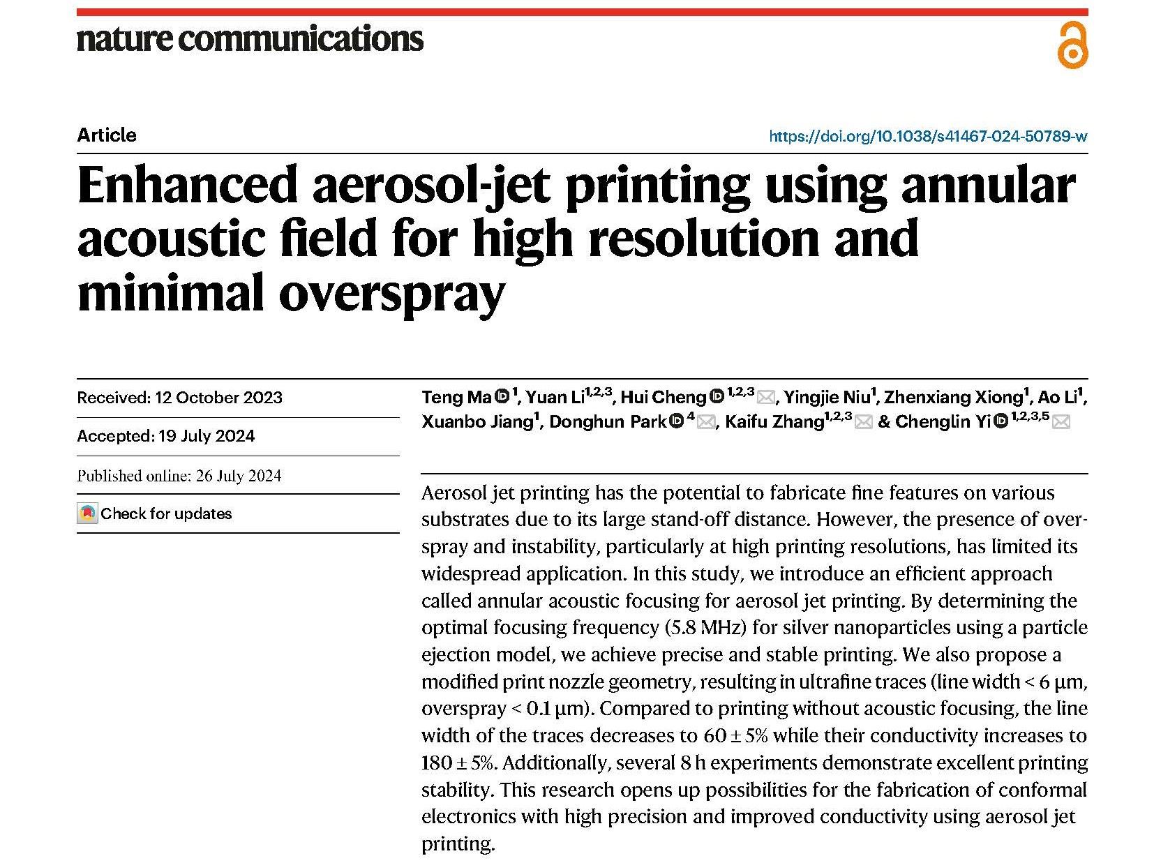 近日,西北工业大学张开富教授团队在气溶胶喷墨打印方向取得了新进展,成功发展了外加声场辅助聚焦的超高精度气溶胶喷墨共形打印策略,突破了行业的极限分辨率,在高精度、高集成共形电子制造领域具有重要应用潜力,研究成果以“Enhanced aerosol-jet printing using annular acoustic field for high resolution and minimal overspray”为题发表在Nature Communications(2024, 15, 6317)上。论文第一作者为博士研究生马腾,通讯作者为张开富教授、程晖教授和易城林教授。原文链接:https://doi.org/10.1038/s41467-024-50789-w