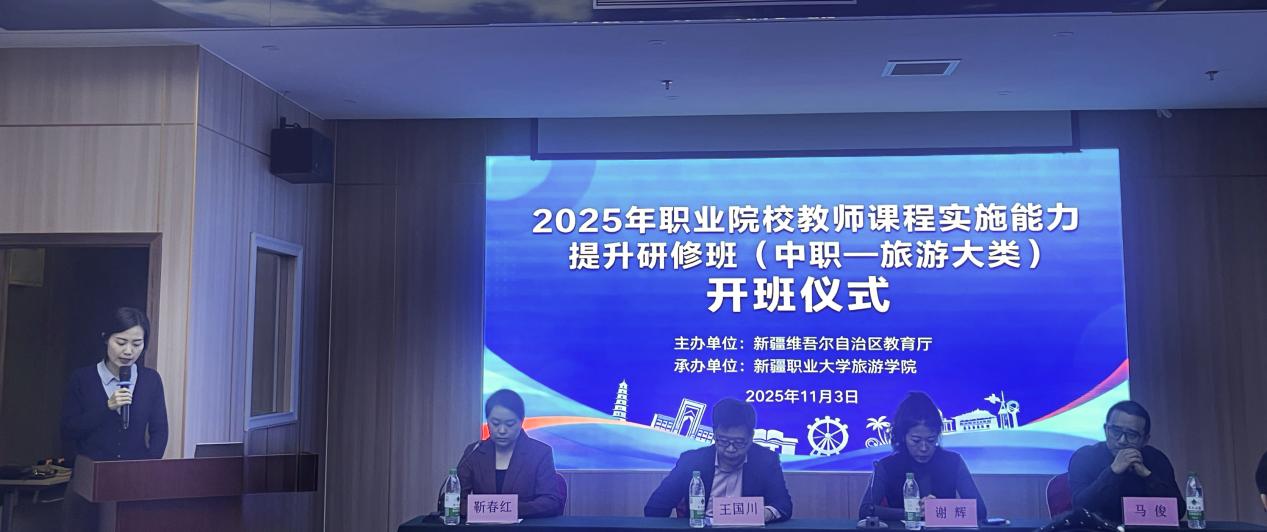 为深入贯彻《教育部财政部关于实施职业院校教师素质提高计划(2021-2025 年) 的通知》精神,落实自治区教育厅关于职业院校教师队伍建设的工作部署,切实提升中职旅游大类教师课程实施能力,2025年11月3日,由新疆维吾尔自治区教育厅主办、我校旅游学院承办的 “2025 年职业院校教师课程实施能力提升研修班(中职-旅游大类)” 在玉龙玺程酒店正式开班。来自全区各地中职院校旅游相关专业的骨干教师齐聚一堂,开启为期14天的系统研修之旅。