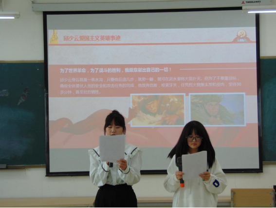 活动的最后,学生以诵读的方式赞颂了两弹一星、社会主义建设者等革命先烈们不怕牺牲、勇往直前的大无畏革命精神。呼吁大家继承先烈遗志,努力学习,把爱国之志变为报国之行。